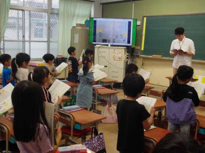隣りどうしで「しりとり」をしたあと、クラス全体で「しりとり」に挑戦しました。