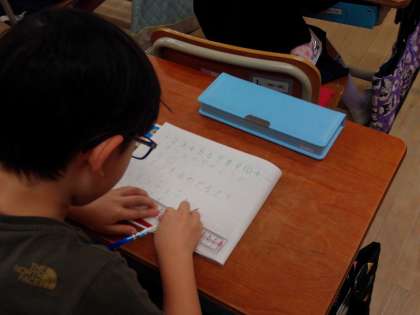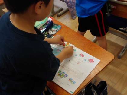 式を書くときの「+(たす)」や「=(は)」、答えを書くときの「たんい」に気を付けて学習しました。