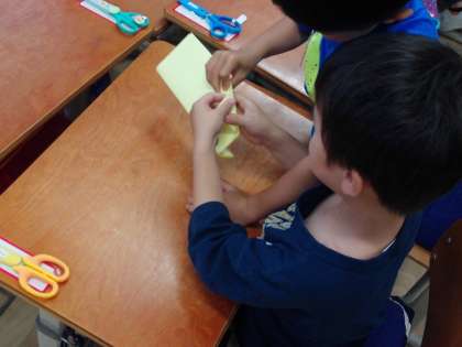 そのままだと立たない色画用紙を、折ったり丸めたりして立てました。