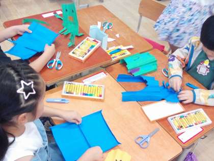 立てた紙が何に見えるか想像をふくらませて、色をつけたりハサミで切ったりして作品を作りました。