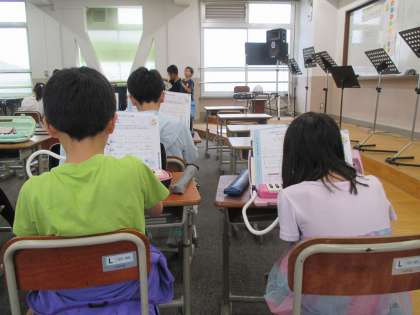 「楽しいマーチ」という曲で、鍵盤ハーモニカとタンブリンなどの打楽器でアンサンブルを楽しみました。