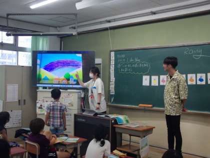 テキストに載っている虹に、自分の好きな色を塗りました。塗った色をクラスのみんなに英語で紹介しました。