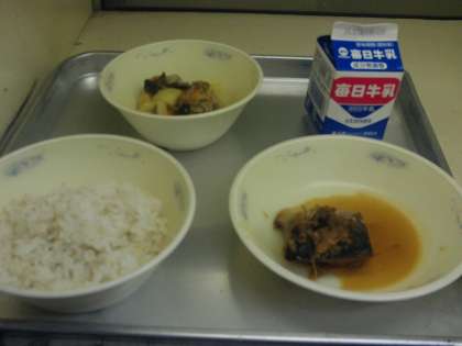 今日の献立は、麦ごはん・さばのかわり煮・豚肉と野菜の煮つけ・牛乳でした。