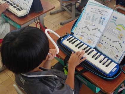 教科書の指番号を参考にしてけんばんハーモニカをひいたり、歌ったりして音楽を楽しみました。