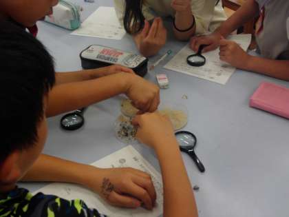 手で触ってみたり、ルーペで見たりして、違いを確かめました。