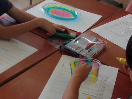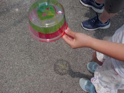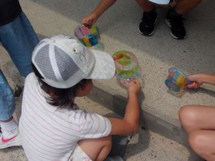 透明容器に油性ペンで色を塗りました。その容器を持って、校庭で太陽の光にすかして観察しました。