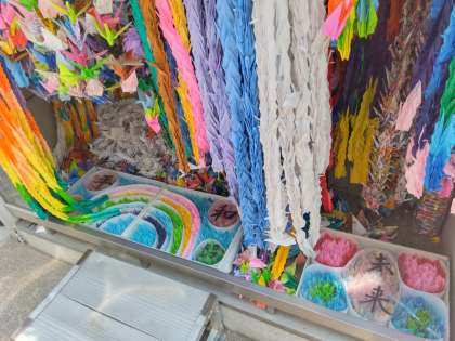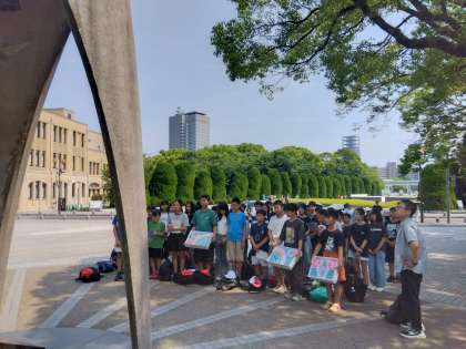 広島平和記念公園に着き、原爆死没者慰霊碑の前で平和集会をしました。学年で考えた誓いの言葉を代表の子たちが堂々と言いました。その後、全校児童、教職員で平和への願いをこめて折った折り鶴をおさめました。