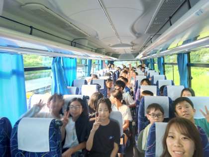 広島平和記念公園一帯での学習を終えました。バスの中は緊急が少し解け、みんなの雑談の花が咲き、なぜかアンパンマンの歌、つばさをくださいの歌の大合唱です。みんなで楽しんでいます。