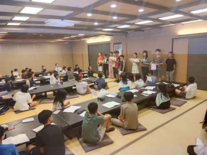 入浴後は大広間で今日1日のふりかえりをしました。班ごとに今日のふりかえりをして、全体で交流をしました。子どもたちが自主的に進め、広島平和記念資料館での学習や、八幡さんの被爆体験の話からのふりかえりが多く聞かれました。この後、各部屋で少しの自由時間をとり、就寝です。