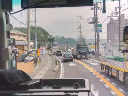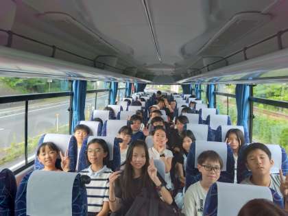 バスは宮島口港へ向かってます。バス車内はみんなリラックス。雑談、歌、フルーツバスケットの花が咲いています。