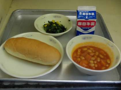 今日の献立は、コッペパン(国内産小麦100%)・牛乳・大豆と鶏肉のトマト煮・ほうれん草のソテーです。