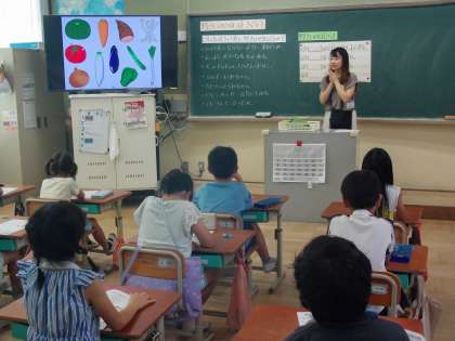 「どうして毎日給食に野菜が出てくるのかな?」と先生が質問すると、「病気にならないようにするため。」「ばいきんに勝つため。」などの答えが出ました。また、野菜にはどんなはたらきがあるのか、クイズ形式で取り組みました。
