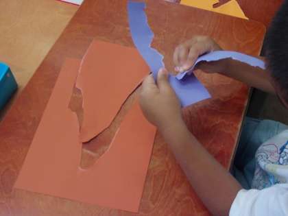 今日は、大小さまざまな色画用紙を手で破って、破った形が何に見えるのか考えました。