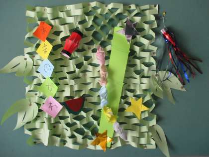 七夕かざりを作りました。テープを細く切って吹き流しを作ったり、色紙で提灯や貝などを作って飾りました。