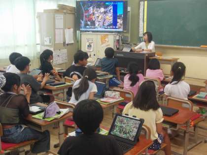 学校で見つけた虫を写真に撮って、教室でテレビ画面に映してみんなで観察しました。