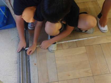 今日は、まきじゃくを使って教室のたてと横の長さを測りました。