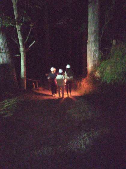 ランタンの灯りだけを頼りにコースを歩くナイトハイク、ドキドキしますがみんなと一緒なら安心!