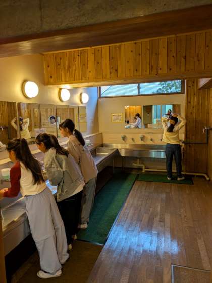 子どもたちは少し眠たそうですか、元気です。洗面、寝具整理、荷物整理をしています。