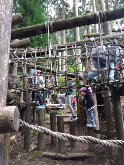 冒険の森、山の斜面にある様々なコースの関門通過を目指します。バランスとパワーがいりますね。