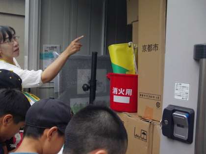 まず、1つ目は、堀川通りに面している体育館の外にある器具庫です。段ボールベッドやトイレ関係(トイレットペーパーや凝固剤など)、避難所の案内垂れ幕、バケツなどが入っており、「これは、何ですか?」と目にするものについて聞き取り、プリントに書き記していました。