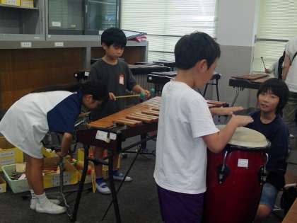 その後,グループ内で話し合って決めた打楽器を使い、合奏を楽しみました。