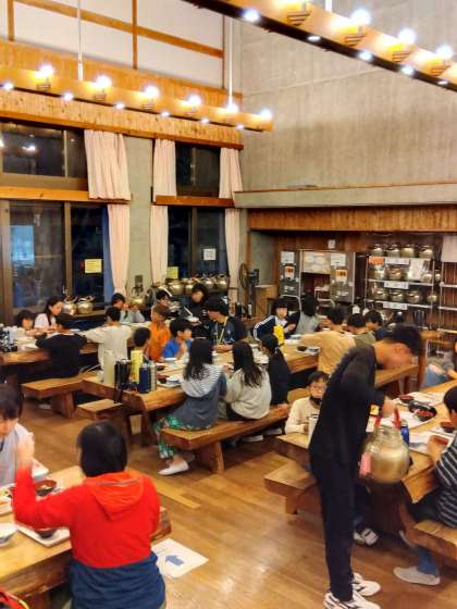 楽しみにしていた夕食、今日は外での活動が続いたのでお腹がペコペコ、バイキングのお替りをしている子ども多く、みんなしっかり食べていました。山の家の食堂の職員さんからも「気持ちのいい食べっぷりですね。」と褒めていただきました。