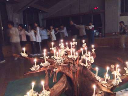 キャンプファイヤーは雨のため屋内のキャンドルファイヤーに変更になりました。練習を積んできた係のメンバーは素早く、本日打ち合わせ、練習をしてみんなを楽しませてくれました。ゲーム、スタンツ、ダンス、歌に大盛り上がり、最後はキャンドルの火が消えるのみんなで見つめました。みんなの表情は山の家で友だちと共に挑戦、協力、感謝に取り組んだことをこれからも大切にしていこうと思っているようでした。
