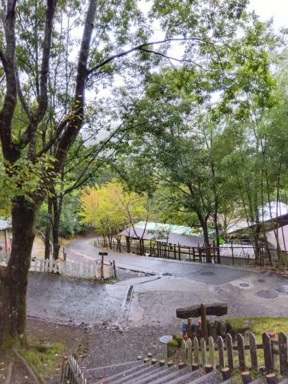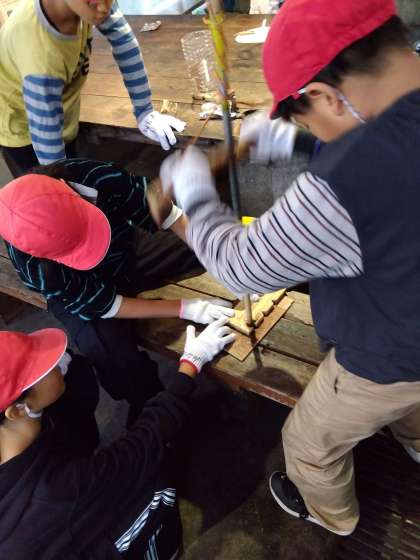 山の上にある第二炊飯場に移動して、火起こし体験をしています。まいぎり式火起こしを使い火を起こしています。できるかな?