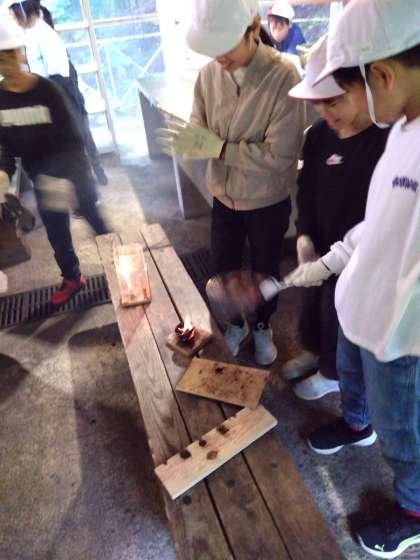 苦労すること30分、軸をうまく回してモグサ、麻ひもに点火させました。班のメンバーで軸を回したり、支えたり、交代したり、みんなコツをつかみました。火って大切なものですね。