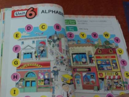 始めに、みんなで『ABC Song』を楽しく歌いました。そして、26文字のアルファベットを、ALTの先生の発音をよく聞いて復唱しました。その後、教科書の絵を見て,隠れたアルファベットを探して発表しました。