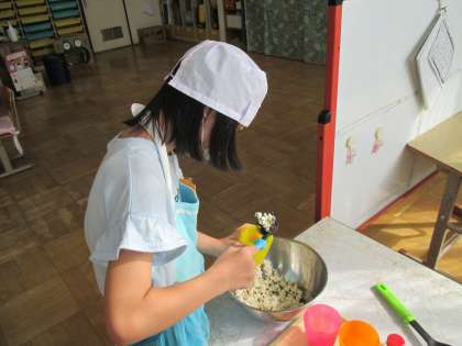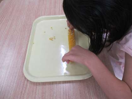 学級園で育てていたコーンを使って、ポップコーンを作りました。収穫して乾燥させたコーンの軸から実を外しました。外すのに力がいりましたが、がんばってたくさんの種を集めました。フライパンに材料を入れ、蓋をして火にかけました。しばらくすると、ポンポンとはじけてポップコーンになりました。その様子を見て、「ポポーン!」と言ってうれしそうでした。コップに取り分けて、おいしく食べました。