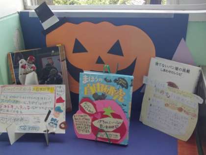 夏休み前に4年生が国語「本のポップや帯をつくろう」で、自分のお気に入りの本の面白さや感動したことなど、自分が伝えたいことを工夫してポップを作りました。そのポップを学校司書の先生が、順次、図書室と職員室前の廊下に展示され、また、その本やポップを置く机の台紙や周りを飾っていただいています。