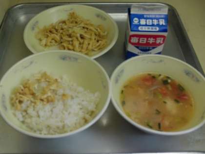 今日の献立は、麦ごはん・牛乳・きつね丼(具)トマトだご汁です。