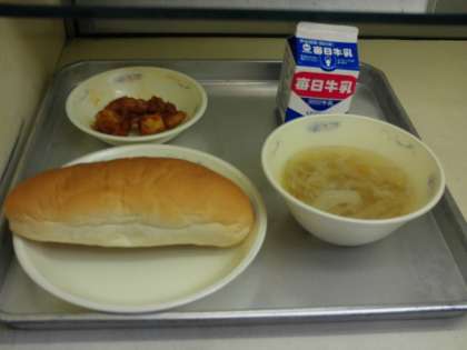今日の献立は、ミルクコッペパン・チキンのアングレス・キャベツのスープ・牛乳でした。