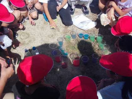 赤、青、黄、緑のえのぐを水に溶かして、新しい色を作りました。
