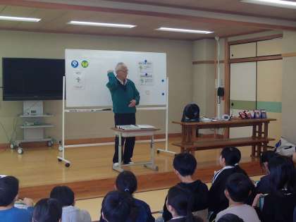 聴覚障害の方をゲストティーチャーとしてお迎えして学習しました。生い立ちやこれまでの生活の様子を手話通訳の方を介してお話を聞きました。昔は、朝起床する時は、窓から入ってくる日差しを浴びて起きていたが、今は、タイマーで風を受けたり、枕下に振動する物を置いたりするなど、福祉機器を活用できるようになり便利になった等、子どもたちに具体的に伝えられていました。また、外見からは分かりにくい障害であるため、身振り手振りや手話、筆談、スマホなどで用件を伝える工夫をされていることを知りました。阪神・淡路大震災の際に、助けの声が聞こえないことで大切な人を救えなかった悔しい思いをされた方のことを教えてくださいました。近所や地域など、身近に聴覚障害の方がおられたら、手を差し伸べて寄り添ってほしいと話されました。福祉機器を見学した後、手話によるコミュニケーション学習として、簡単な手話を学びました。どんな手話を知ったか子どもに尋ねてみてください。北区社会福祉協議会、紫竹社会福祉協議会の方々、そして手話通訳の方にお世話になりました。ありがとうございました。