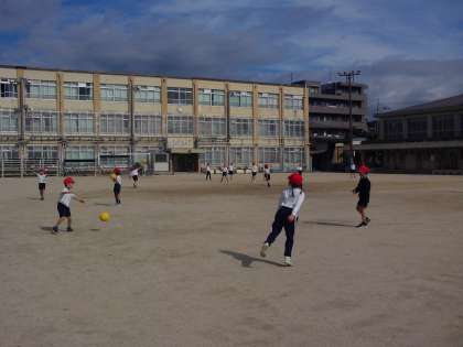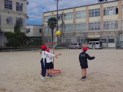 パスをつなげてゴールを目指しました。相手が取りやすいボールを投げたり、地面にバウンドしないようなパスを練習したりしました。
