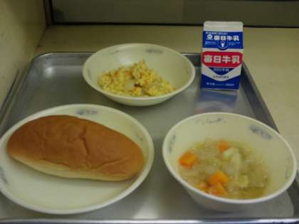 今日の献立は、味つけコッペパン・牛乳・ベーコンとポテトの変わりオムレツ・野菜のスープ煮です。