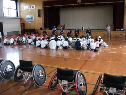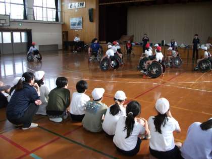 京都紫竹ロータリークラブ、京都市障害者スポーツセンター、パラスポーツの選手の方々にお世話になり、車いすバスケットの体験をしました。車いすの違いや、選手の方の技術、体力、気力のすごさ、また競技としての車いすバスケットのすごさや楽しさを実際に選手の方々と共にゲームをしたり、話し合ったりする中で体感しました。そして、乗り越える時に優しい手助けが大切であることや、対話をして友だちになることの大切さも学びました。京都紫竹ロータリークラブ、京都市障害者スポーツセンター、パラスポーツの選手の方々、お世話になりありがとうございました。