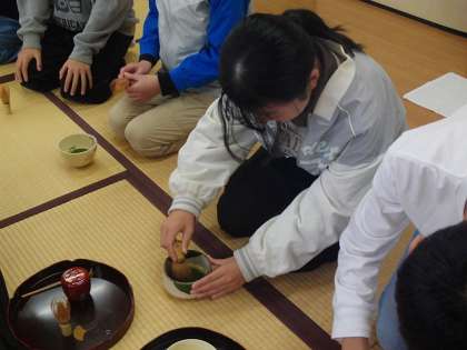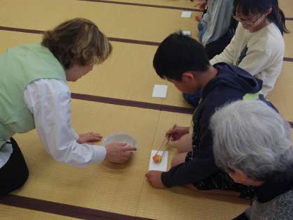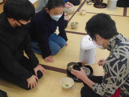 紫竹地域女性会の方々にお世話になり茶道教室をしました。「おもてなしの心」や「人を敬う気持ち」などの心構えを大切に、お菓子のいただき方やお菓子の食べ方、お茶碗の扱い方、お茶の点て方を教わり体験しました。