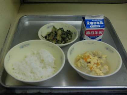 今日の献立は、ごはん・牛乳・高野どうふの卵とじ・ほうれん草と切干大根のごま煮です。