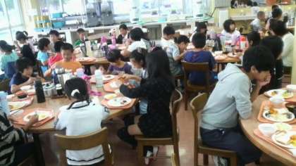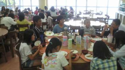 朝食の様子です。海を見渡せる食堂でのバイキング形式の食事です。自然の家では全食をこのようにいただいています。みんな元気で食欲旺盛です。