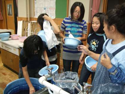 学区に住まれている高須さんをお招きして,藍染の歴史や日本の文化についてお話をしていただき,その後に「お弁当包み」の藍染を体験しました。
