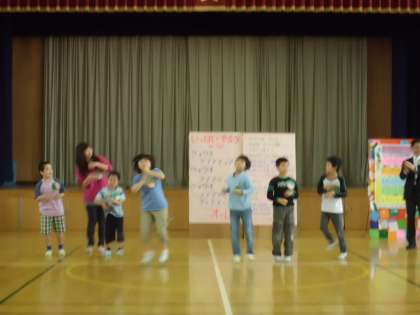 学校紹介では,「名前・学年・楽しみにしている合同行事」をみんな大きな声で自己紹介しました。その後,「君に100パーセント」を歌っておどりました!