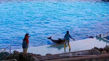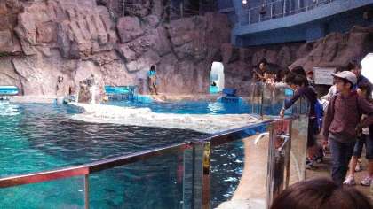 午後は名古屋港水族館での活動です。昼食はスタジアムで「イルカショー」を