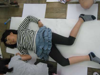 大きな紙の上にねころんでポーズをとり,友達に下書き線を引いてもらいました。等身大の自分を描くことは今までになかったので,とても興味をもって学習出来ていました。