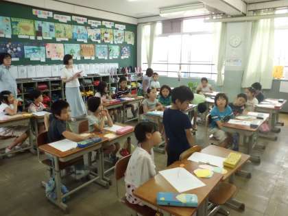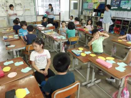 子どもたちは1回目の探検でみつけた「紫竹のとっておき」を友達に紹介をします。二人組のぺアで,相手を変え,5人の友達から紹介をききます。話し手と聞き手を変えてまた5人からきき,10通りのトーキング学習が展開しました。