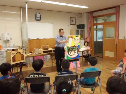「紙芝居」は手作り・オリジナルの大型紙芝居で,大変ユーモアと知性にあふれた傑作でした。子どもたちの笑顔が絶えない2本の楽しい紙芝居でした。
