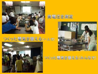 次に,風の力を使ってエネルギーを作る風力発電について実験をしました。まず発電機のしくみを知り,うちわで風車を回しつくった電気でオルゴールを奏でました。また作った電気の電圧を測ったり,電気を蓄えるコンデンサを使って発電量も確かめることができました。一人で蓄電,みんなで蓄電して動くカエルの人形でそのエネルギーを確認しました。