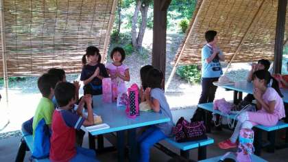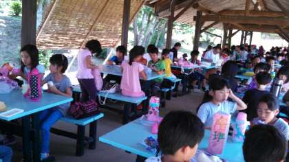 1日目の昼食はお家の方に作っていただいたおにぎり弁当です。子どもたちは,愛情たっぷりのお弁当を美味しそうにほおばっていました。